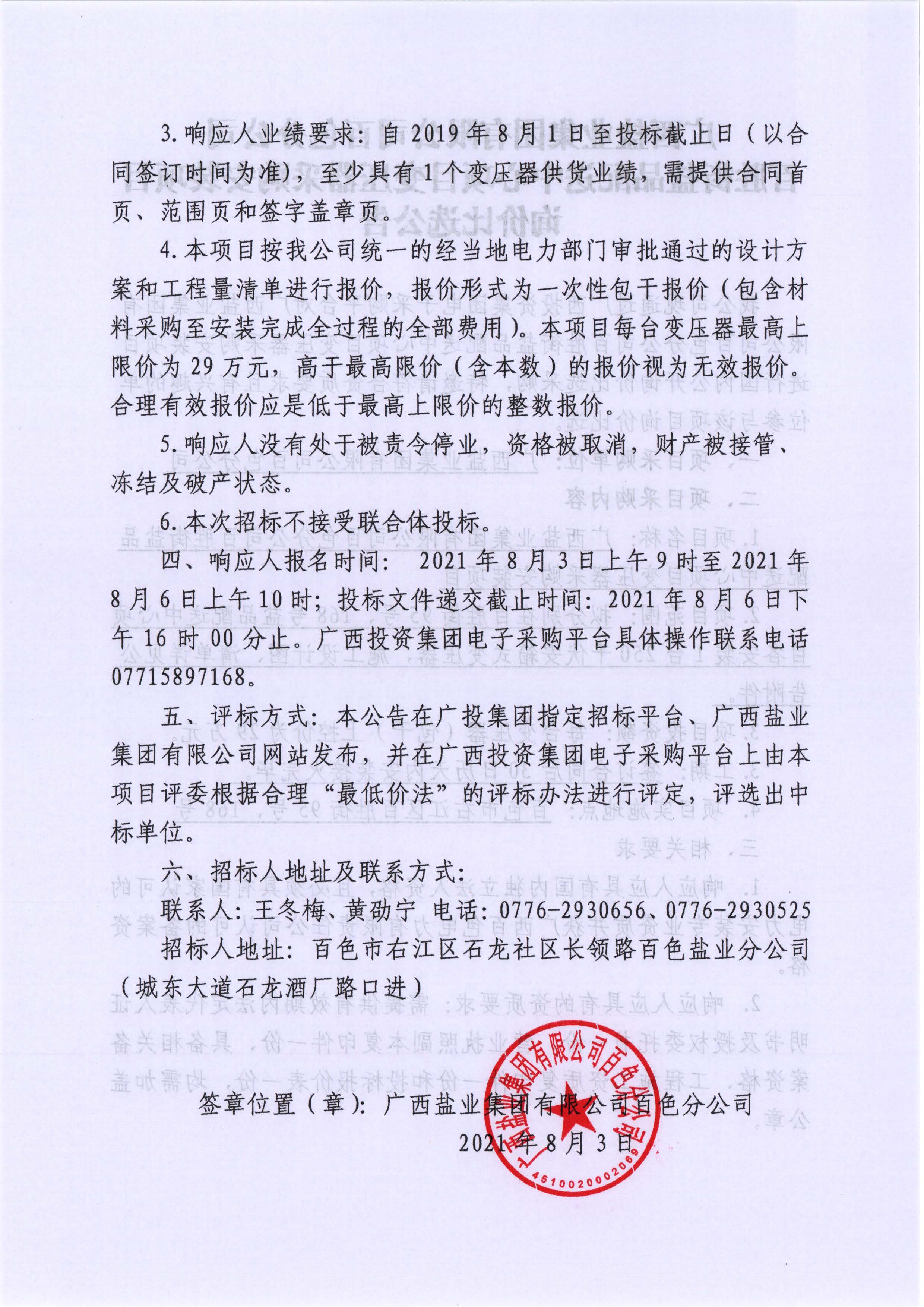 廣西鹽業(yè)集團(tuán)有限公司百色分公司百勝街鹽品配送中心項(xiàng)目變壓器采購(gòu)安裝項(xiàng)目詢價(jià)比選公告